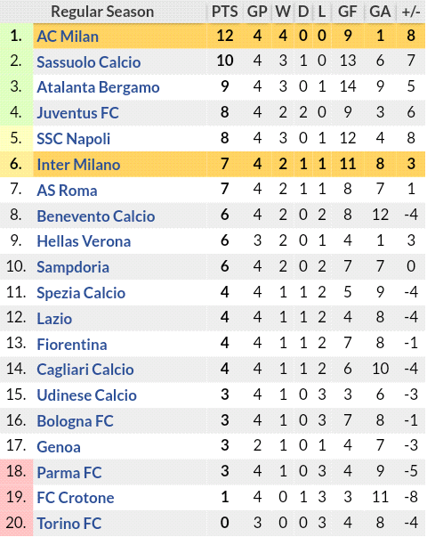 Pics. The above table shows ac milan results against each league opponent. Detailed info on squad, results, tables, goals scored, goals conceded, clean sheets, btts, over 2.5, and more.